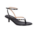 Esse modelo de sandália minimalista em couro preto é um sapato versátil para qualquer estação. essa sandália fica ainda mais especial com o salto kitten heel fino, que eleva o modelo, e ao fechamento de mini fivelas no tornozelo e sob o pé na lateral.