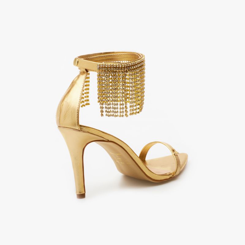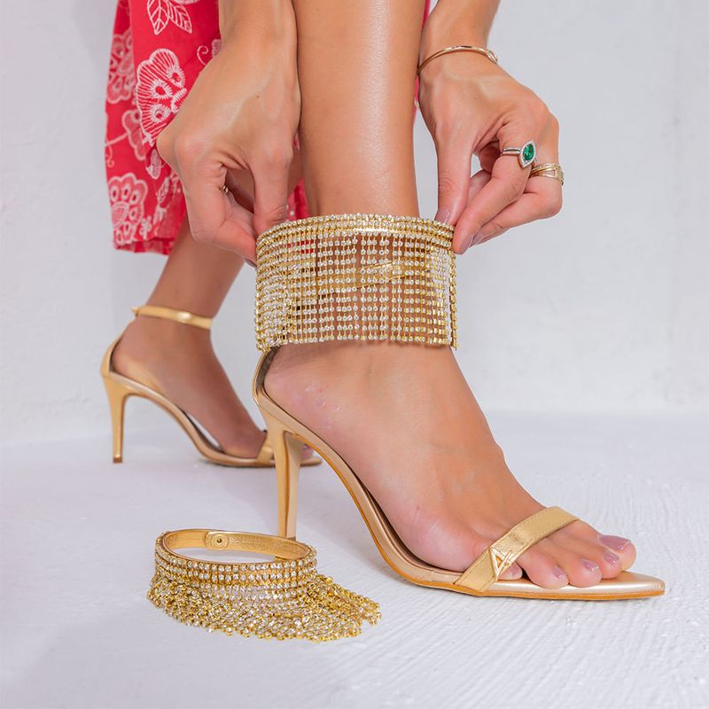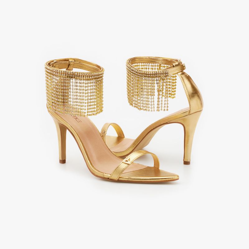 Sandália feminina dourada confeccionada em material sintético PU e solado em Couroplac; Modelo conta com cabedal em tira única frontal transparente, bico fino e salto com 10 cm de altura; Possui tornozelos com aplicação de franjas coloridas e fechamento posterior lateral por fivela; Palmilha confortável com nome da marca e forro sintético; Por conter uma forma menor, indicamos comprar uma numeração acima; A sandália dourada feminina com aplicação colorida é o calçado ideal para o seu glam look! Aposte com um vestido midi cheio de detalhes e combine com um bolsa clutch, para um visual ainda mais interessante; A sandália feminina dourada com franjas é o calçado trend que você precisa ter nos seus melhores looks; Aposte no modelo que todas as fashionistas estão amando;