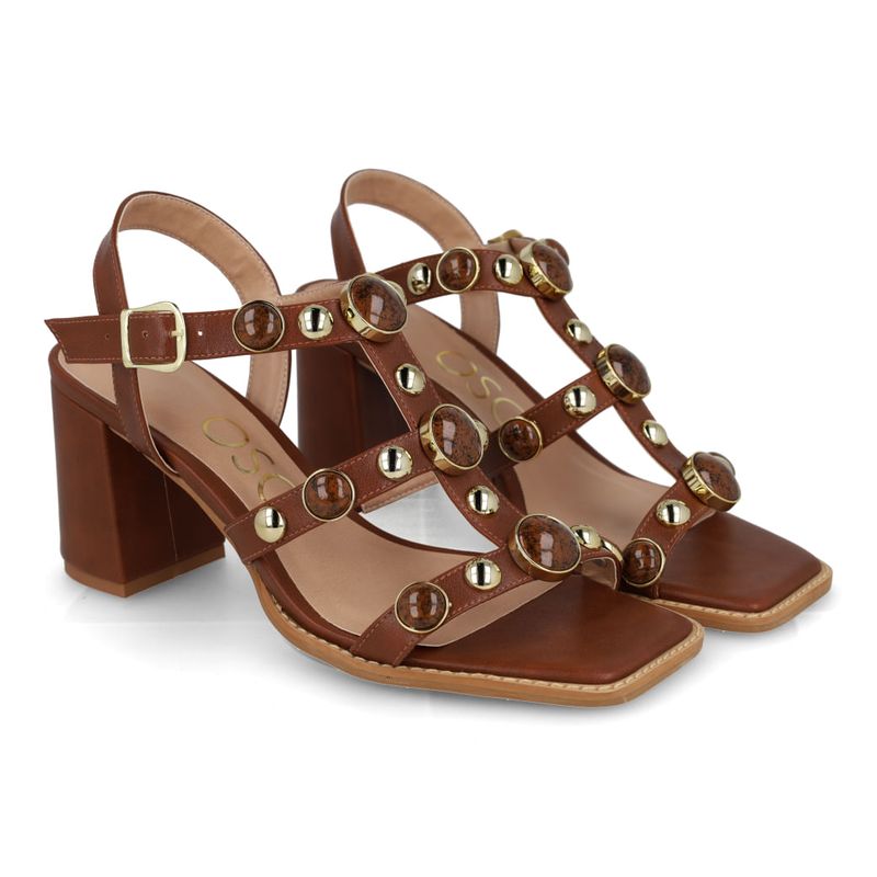 Sandália OSC Salto Grosso Feminina Marrom Com Pedras