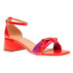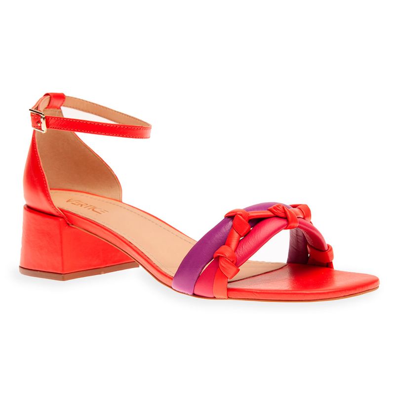 Sandália colorida confeccionada em material de couro e forro sintético; O modelo possui bico arredondado, tiras frontais duplas com trama entrelaçada, palmilha macia com nome da marca e solado em micro, garantindo leveza ao calçado; Salto médio com 4,5 cm em formato bloco, fechamento posterior com fivela dourada e contraforte para proteger o calcanhar; Nada melhor do que completar um visual moderno e criativo com as sandálias de salto bloco colorida.; Aposte com o nosso conjunto estampado laranja para um visual fashion e leve! As sandálias coloridas são a aposta deste verão e prometem fazer parte dos melhores looks das influs de moda, aposte!