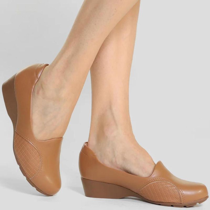 O scarpin Modare tem como diferencial o salto anabela e o cabedal flexível nas laterais, que promovem maior conforto para quem precisa de cuidados com o joanete. Um estilo clássico com o bem-estar que o dia a dia pede.