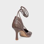 Scarpin lace-up com vazado de recorte a lazer formando o ícone Carrano por todo o shape. Fechamento em amarração de couro, possui o salto fino alto e bico quadrado. Com palmilha da cor do modelo, possui também o ícone e a inscrição do nome da marca.
