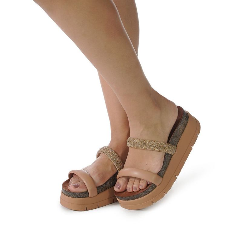 Tamanco Feminino Plataforma Tiras Brilho Moleca Bege